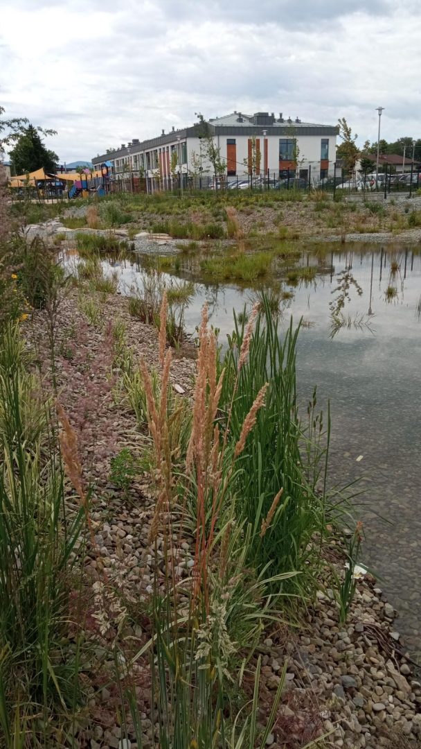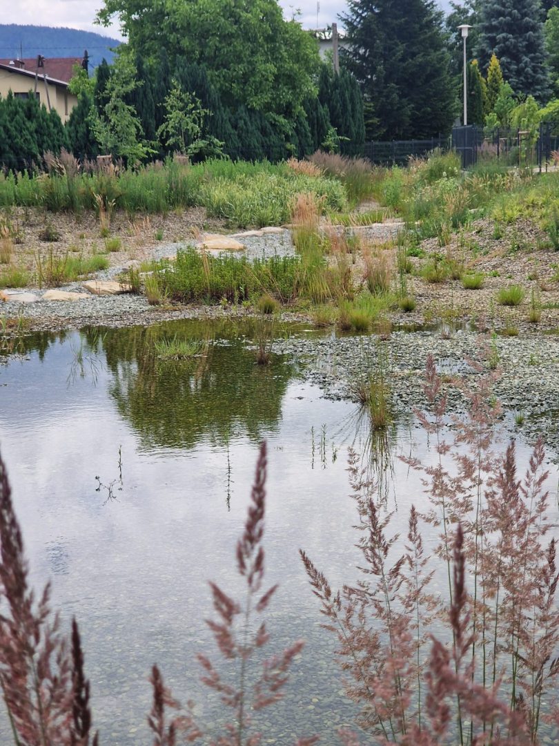 Nie do przecenienia jest również walor edukacyjny i sensoryczny ogrodu. Dzieci mogą obserwować naturalne procesy obiegu wody, sezonowe zmiany roślinności oraz funkcjonowanie małego ekosystemu. W okresach niskiego poziomu wody teren może być użytkowany – pod opieką wychowawców – jako przestrzeń edukacyjna i rekreacyjna, wspierająca rozwój poprzez bezpośredni kontakt z przyrodą.